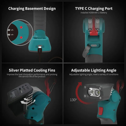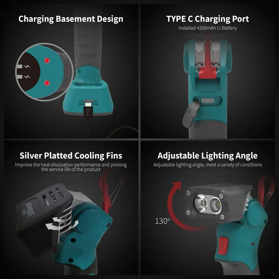 La linterna de trabajo portátil SUNREI L1000 ofrece 1000 LM con 2 LED CREE, combinados con luz de inundación y luz de enfoque. El cabezal puede girar 130° para adaptarse a diferentes entornos de trabajo. Incluye una batería de litio de 4200 mAh y su diseño desmontable permite colgarla fácilmente del cinturón o en cualquier otro lugar. El imán en la base también permite colocarla donde más se necesite la luz. La L1000 cuenta con dos modos de carga para mayor comodidad del usuario: el puerto de carga tipo C y una base de carga.